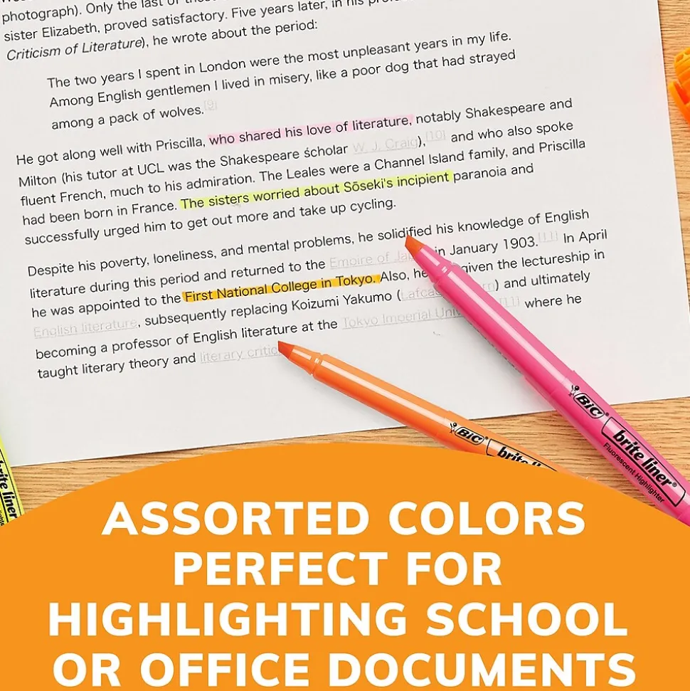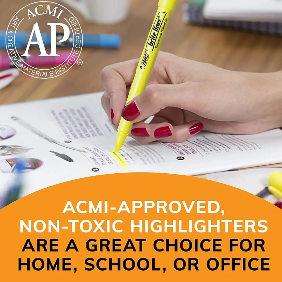 These highlighters have a chisel tip for broad highlighting or fine underlining, making them perfect for highlighting school or office documents. BIC’s highlighter markers use translucent ink to emphasize what’s important on the page without obscuring the text below. Reliable and long-lasting, each BIC Brite Liner highlighter writes for up to eight hours without a cap and does not dry out, so you can work with confidence. The convenient pen-shaped design lets you easily grip and comfortably use the highlighters to organize your notes or underline passages in textbooks, notebooks and documents. Looking for classic yellow highlighters for journals or assorted color marker sets for adults? BIC Brite Liner Multicolor Highlighters add a fun pop of flair to your art, office or school supplies. Each pack contains five chisel tip highlighter markers in the following assorted colors: yellow, pink, blue, green and orange. BIC highlighters are ACMI-approved for a high-quality, safe product you can trust. Whether you’re emphasizing text or just feel like getting creative, choose BIC Brite Liner Highlighters.