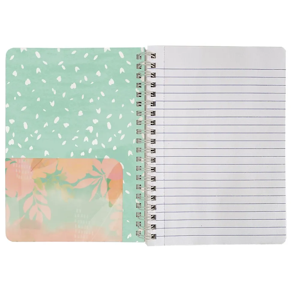 The Silver Lining Personal book is 5″ x 7″ with 80 college ruled sheets & is the perfect size to keep handy for any note taking. Both fashionable and functional, the Silver Lining Personal book features sturdy board covers with silver foil front cover accents. The inside front cover has a pocket for holding small notes, business cards and receipts. Designs can include: popular variations of blue and purple color combinations, Lavender and light orange painterly watercolor designs, Coral background with floral designs and inspirational messages. As an added surprise, in addition to the front and back covers being designed, the inside front and inside back covers are as well! The design is chosen at random, no requests can be made. Includes 80 college ruled sheets which are perforated for easy removal from the silver twin wire binding
