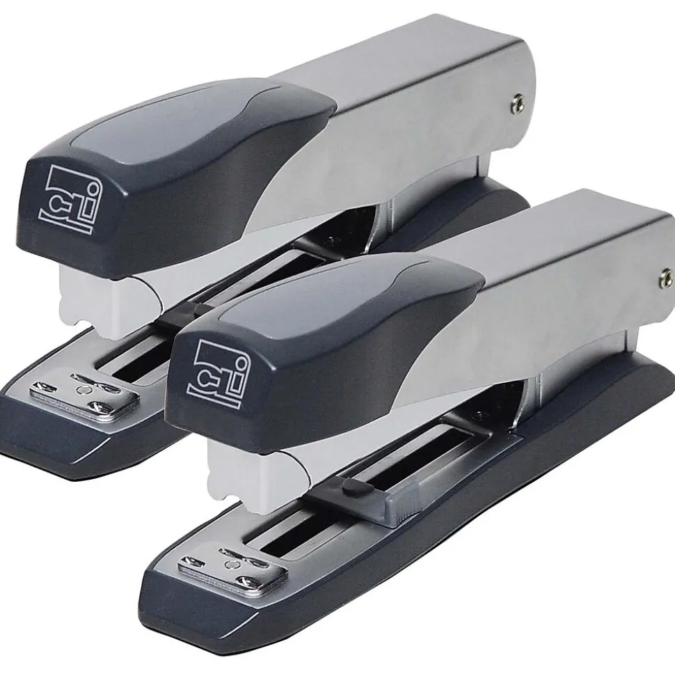 This stapler features a modern design for the office professional. Durable metal construction with non-skid base. Jam resistant mechanism; open channel and push front loading. Rotating anvil for stapling or pinning. Adjustable throat depth of up to 3″. Uses standard 1/4″ and 5/16″ staples, can staple up to 50 sheets. Full strip. Pack of 2 staplers.