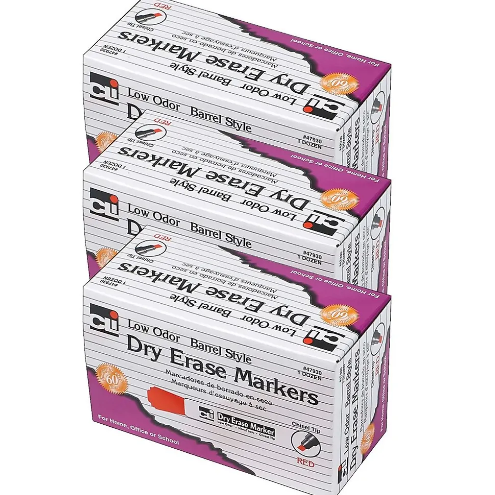 These dry erase markers are low odor but feature bold, bright vivid colors. Making sure that all your work can be seen, whether you are at the back of the class or boardroom! These dry erase markers can be used on dry erase boards, glass or any other dry erase surface. Markings will wipe away cleanly and easily using either a dry erase eraser or cloth. These barrel style markers have chisel tips and are AP Certified, NON-Toxic, conforming to all ASTM D-4236 standards. Box contains 12 red dry erase markers. Sold as 3 boxes, 36 markers total.