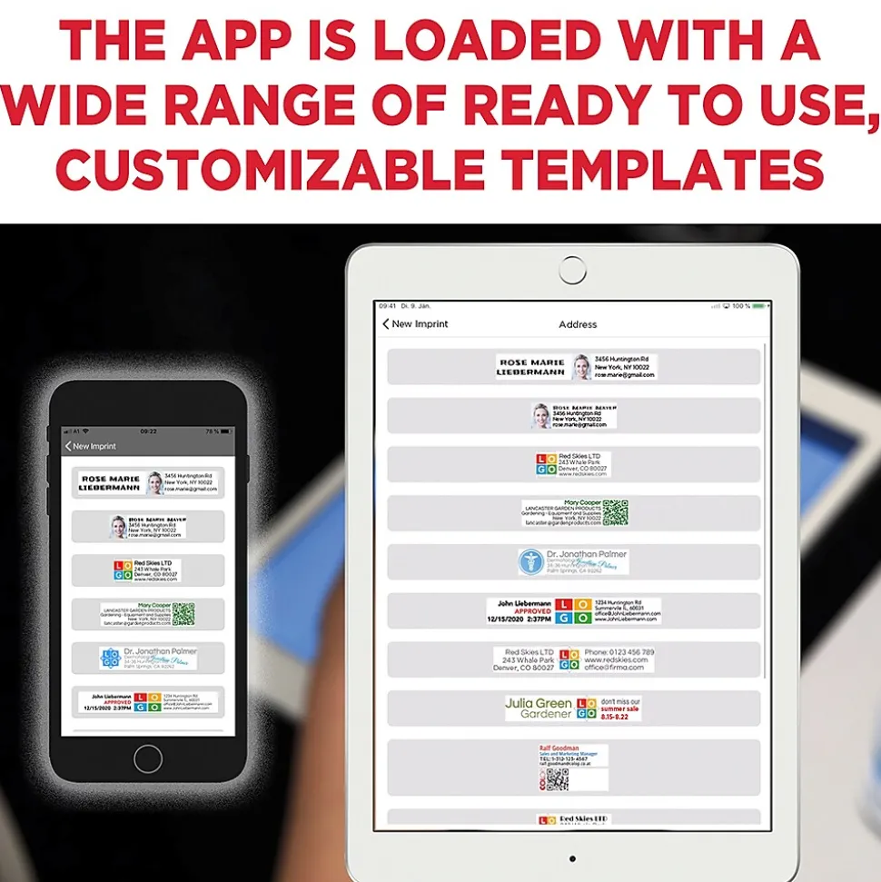 COLOP e-mark is a wireless marking device. Using an app on a a mobile device (such as a mobile phone or tablet), users can create and change their full-color impressions as often as needed. The app features a custom design studio as well as numerous editable templates and stock messages to fulfill all marking needs. Easily upload logos, signatures, files and so much more! Great for branding/advertising, labeling, numbering, time/date marking, barcode, QR coding, shipping and receiving. e-mark offers up to 5000 mulit-color impressions with just one ink cartridge.Fast data transfers and the flexibility to switch impressions easily.Individiual imprint designs.Ready to use stamps.