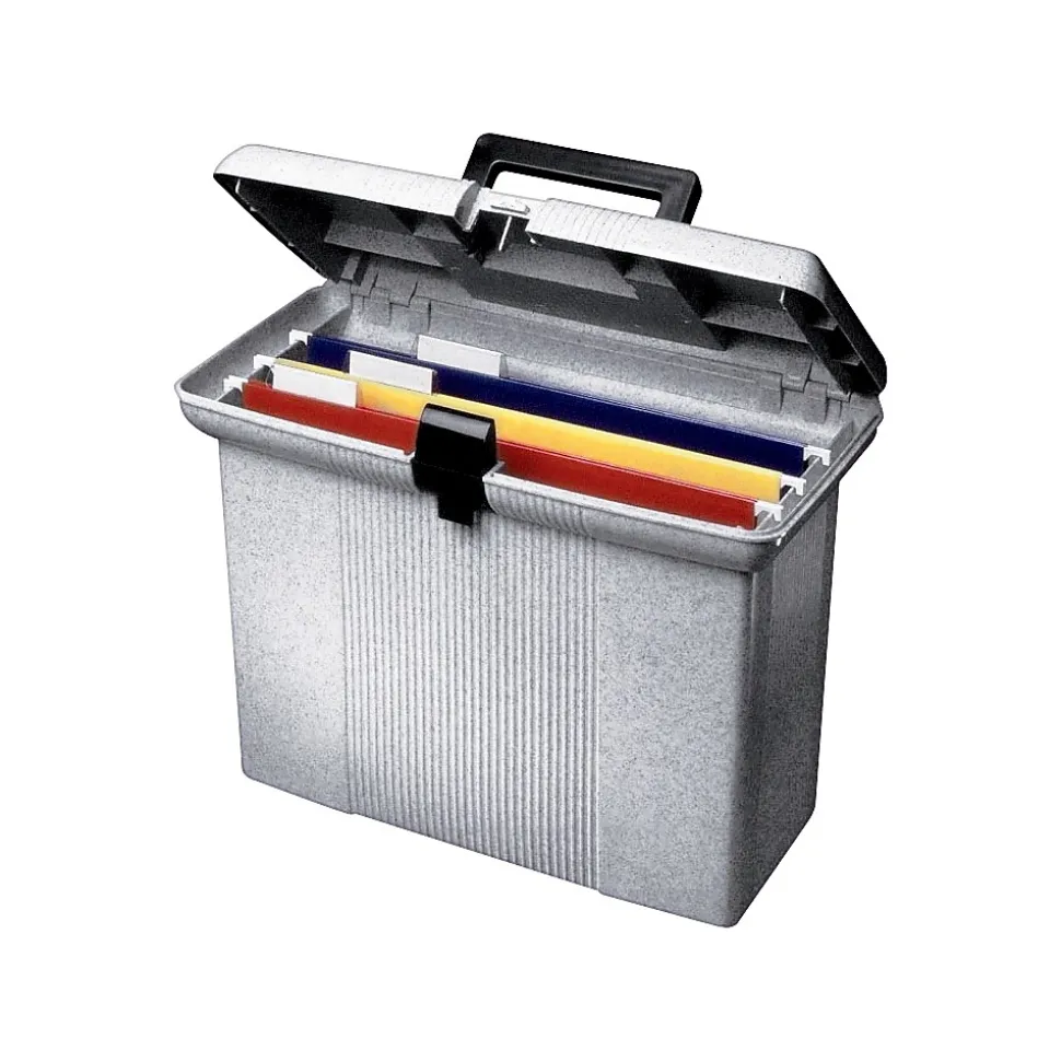 The Portfile Plastic Hanging File Box gives you a complete, ready-to-use portable filing system with a durable built-in recessed handle. The lightweight plastic hanging file box provides carrying ease and a self-locking lid to help keep contents secured. The handle folds down for a convenient storage solution. Includes 3 black reinforced hanging folders with tabs and blank inserts.