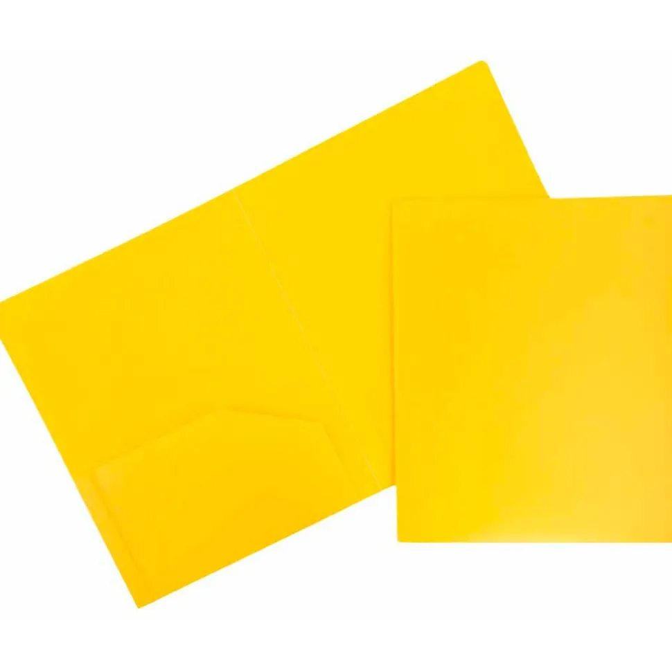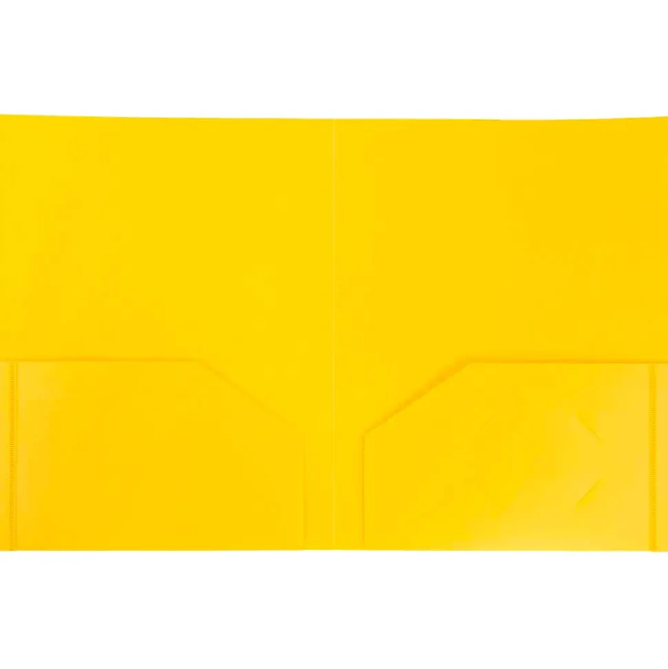 Do your notes or documents tend to get lost in the mess and disorganized in the business of life? JAM Paper® Yellow Heavy Duty Two Pocket Plastic Presentation Folders can help you get your documents in order and will allow them stand out so you can find them quickly and easily! These bright yellow folders are made out of an especially durable, heavy duty plastic and measure 9 x 12 inches in size, making them ideal for standard sized sheets of paper. Each one has the capacity for up to 20 sheets! On the inside, each of these folders has two pockets. The pockets on the right side contain a slot for keeping and displaying business cards. Use these reliable folders in the office, at home, or on the go! This pack contains a total of 6 folders!