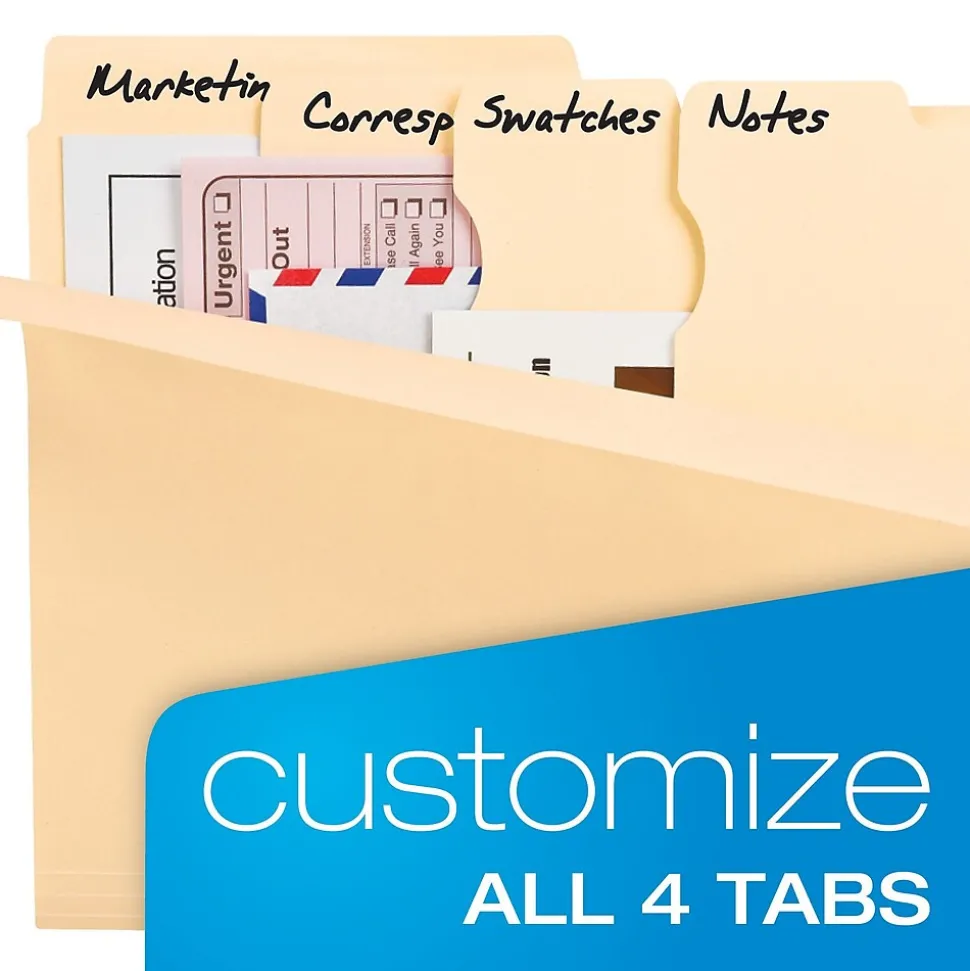Includes four tabs for easy labeling of both the folder and three subdivisions inside it. The manila paper is durable and easy to write on, making these folders versatile, while the standard letter sizing works with most documents. Resistant to staining and abrasion, these folders are designed to handle the rigors of regular office use.