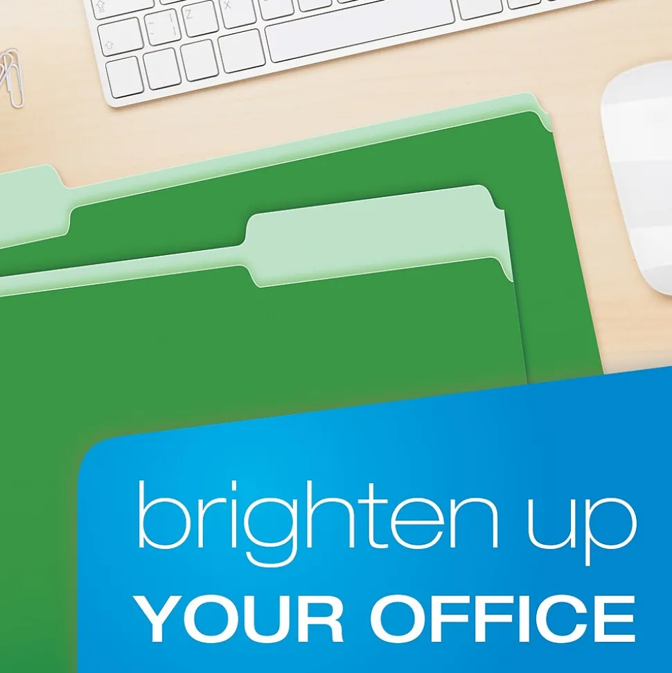 Interior file folder in green color fits neatly inside a hanging folders without obscuring tabs. Folder features two-tone design that prevent misfiles and is reversible to double your color options.