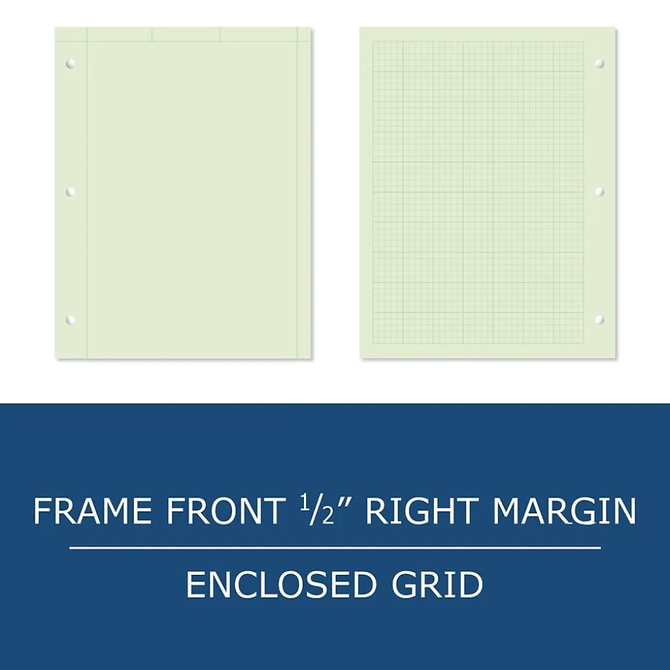 This Roaring Spring Paper Products notebook is excellant for use in engineering classes and labs. Smooth, green tint 20 lb. heavyweight writing paper is plain, except for the printed outline box on the top of the sheet, and has a 5″ x 5″ grid layout printed on the back of the sheet. The back grid shows through to front as dimensional guide for drawings and layouts. Three-hole punched to fit in standard three-ring binders. Sheet size is 8.5″ x 11″. 80 sheets per notebook. Oversize double pocket included under the cover. Proudly made in the USA.