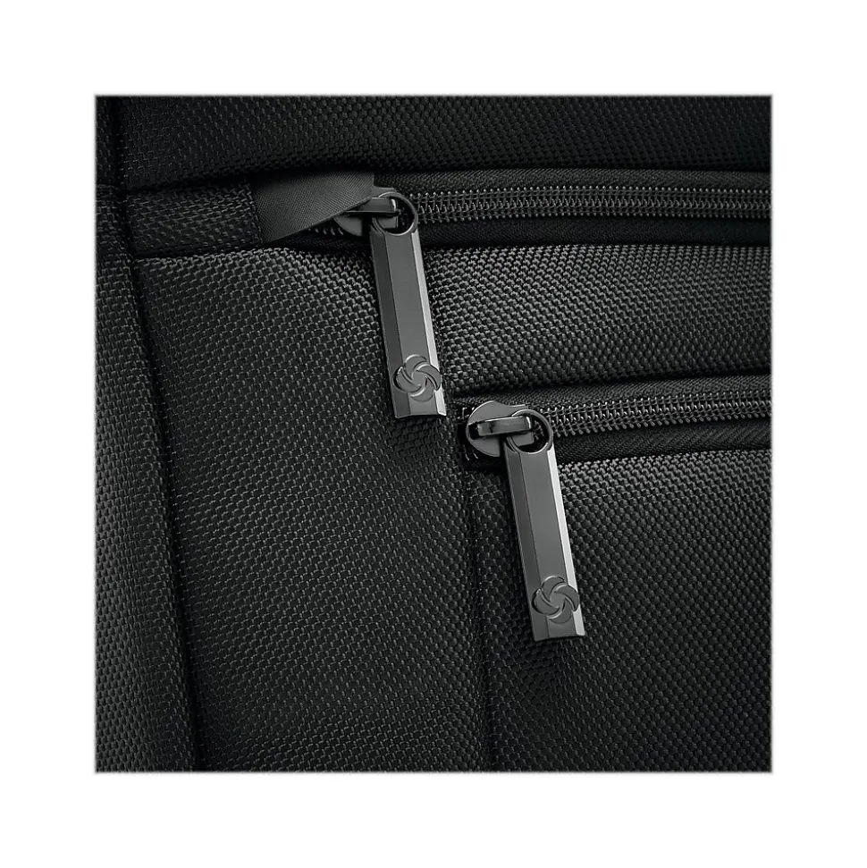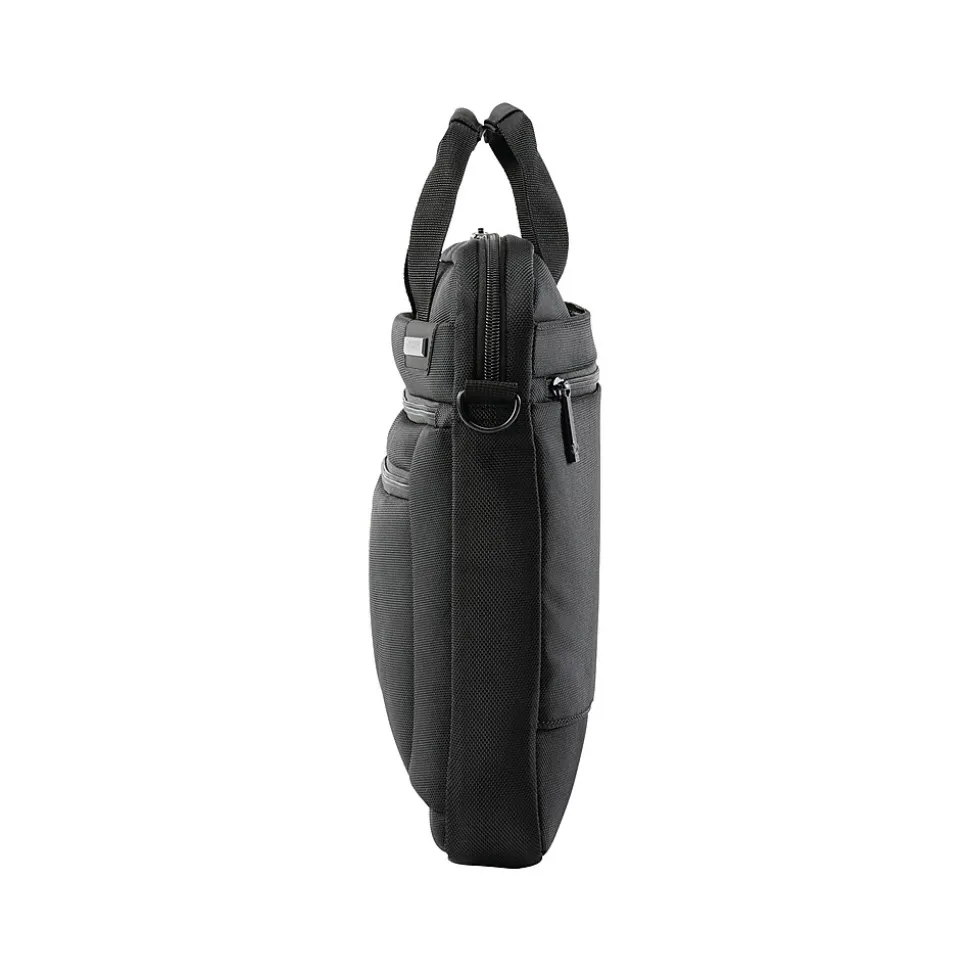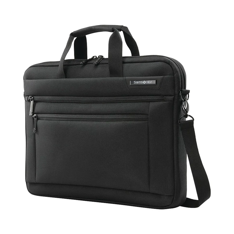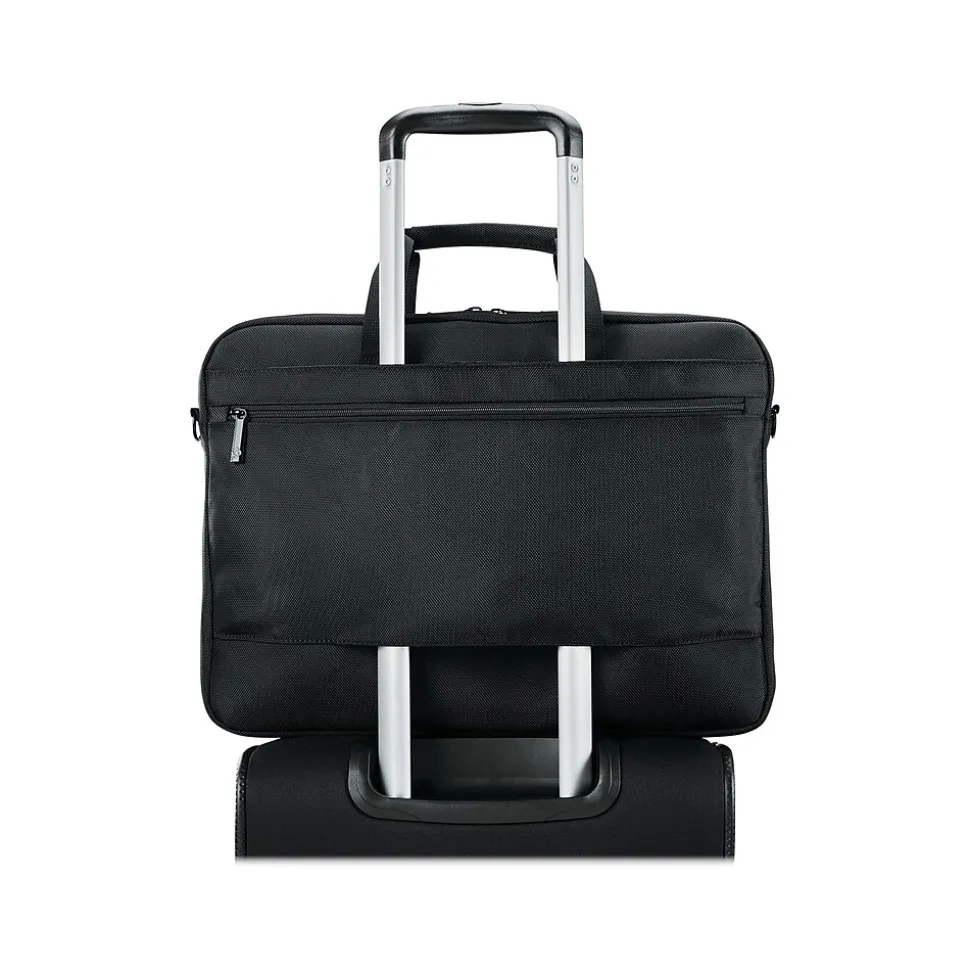 The laptop shuttle provides hands-free convenience and protection for your laptop or tablet. Slim, lightweight profile with two front zippered pockets, one quick-access pocket for smaller items, and one larger pocket to store need-it-now essentials. Wrapped bale handles provide comfort when carrying, and SmartSleeve feature fits over most upright handles for hassle-free combination travel. Adjustable, removable carry strap features a comfort pad and is sized to wear on the shoulder or across the body. Padded laptop compartment sized to fit most laptops up to 17.3″