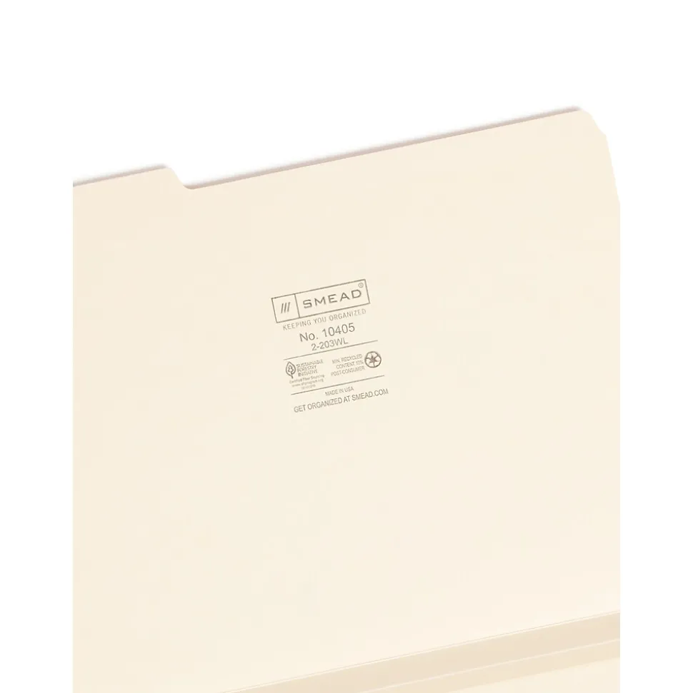 Manage large files and organize documents with this 50-count box of Smead file folders. The 14-point manila material protects and contains files to transport in or out of the office, and the 1.5-inch folder expansion supplies plentiful storage space for multiple documents in each folder. Reinforced tabs on these Smead file folders provide extra durability for long-term daily use.