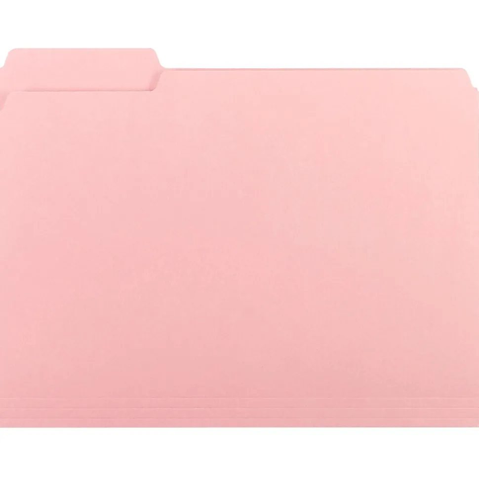 Reduce paperwork clutter by using these letter-size interior file folders. With assorted tab positioning, these folders are ideal for use within a single hanging folder, and the eye-grabbing pink color helps speed up the retrieval process. These Smead 1/3-cut tab file folders are constructed from 11-point stock for increased strength and durability, keeping important documents protected.