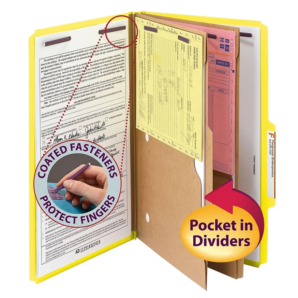 Fastener folders feature SafeShield Coated Fastener Technology the solution to fastener issues, including paper tears, finger cuts and excessive fastener crinkling. Each folder has two 2″ SafeShield Bonded style coated fasteners in positions 1 and 3. 1/3 cut tab is reinforced and 1/2″ high. Folders are made of 11 point stock and are scored for 3/4″ expansion.