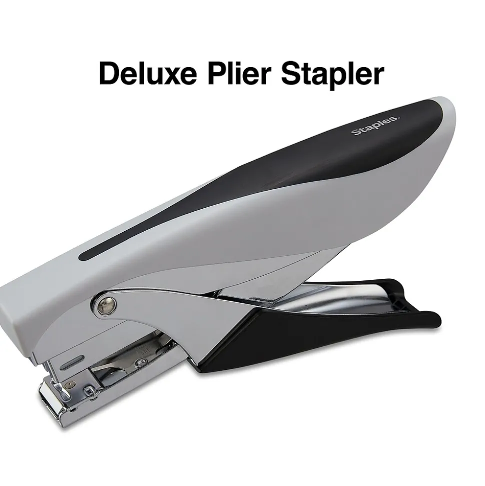 Handle every collation task with this deluxe stapling-plier stapler. The soft, contoured handles provide the comfort needed for repeated use, while the gray-and-black coloring offers a sleek, professional look. This Staples stapling-plier stapler has a unique hand-held shape that reduces fatigue while increasing stapling control, helping ensure high-quality results each time, while the all-metal construction protects it from wear and tear.