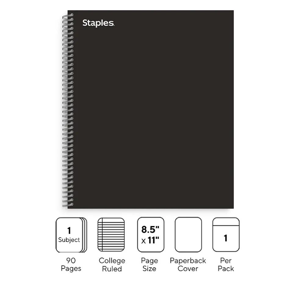 Come to your business meeting or class prepared with this 90-sheet premium paper notebook. The strong twin-wire coil binding supports flat positioning so you can find information quickly, while the durable cover protects your documents. Slip cards and loose papers in the convenient pocket divider. This Staples Premium 8.5 x 11-inch black college-ruled notebook has convenient perforations for clean page removal.