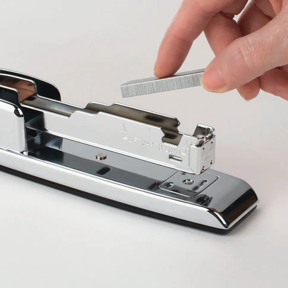 Eye-catching chrome over durable metal construction sets this stapler apart from the competition. More than just a sophisticated design, it provides reliable stapling performance. Capable of stapling up to 25 sheets at once with recommended staples this legendary 747 promises long-term stapling integrity. The specialized inner rail also stabilizes the stapler for jam resistant use. The stapler opens for tacking, and also has a reversible anvil to create pin staples for temporary fastening.