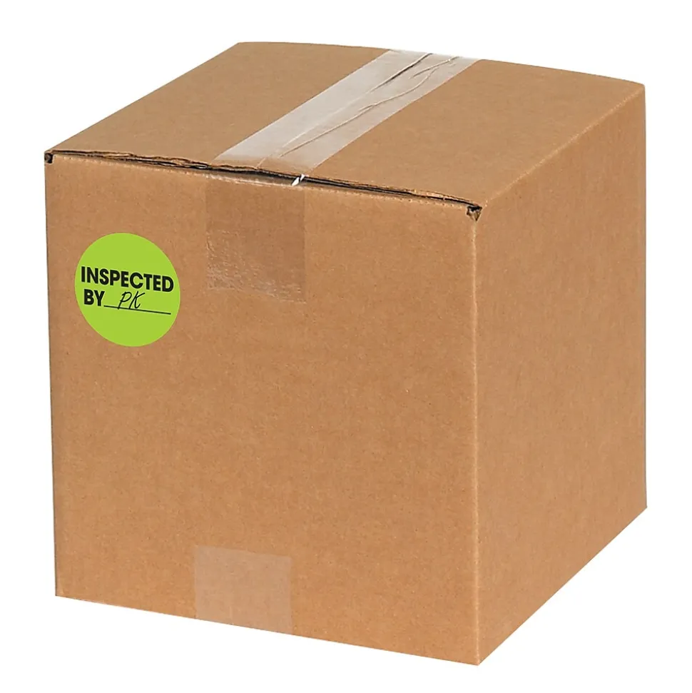 Tape Logic™ 2″ “Inspected By” Labelin fluorescent green color is printed with black color text. Label in circular shape has pressure sensitive adhesive for quick attachment on any surface, sold as 500 per roll.