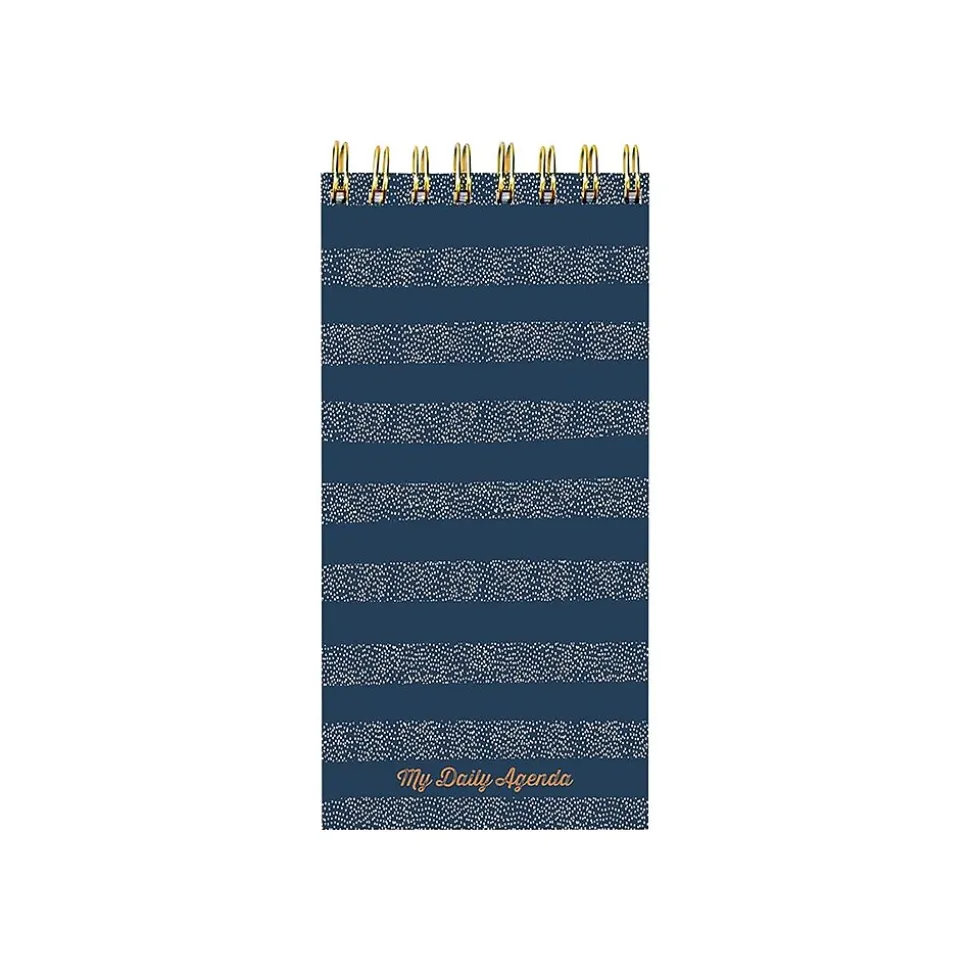 Navy and light blue stripes give this daily agenda a professional look which is still full of personality. Conveniently sized at 4″ x 8.5″, it is perfect for any on-the-go lifestyle. With the open-dated format, you can choose how structured your plans will be for a particular day. Each of the 130 lined perpetual sheets has a place to circle which day of the week it is and a place for the day’s date. Each sheet is also segmented into three sections: morning plans, afternoon plans, and etc. section for those extra daily reminders. The planner features wire-O binding that allows it to lay flat easily, a convenient flip between pages, and hard, durable front and back covers. Secured with an elastic band.