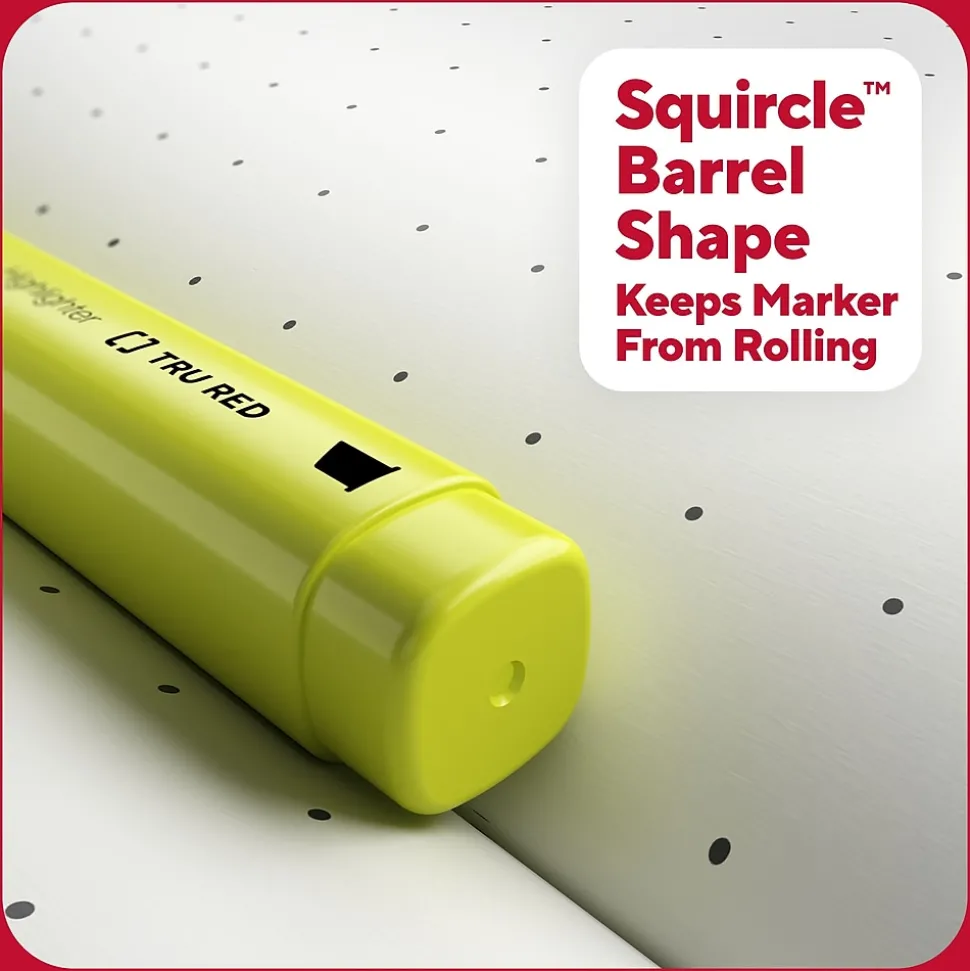 Highlight all the key information you want to remember in big swipes of bold color or create bright, thin lines for important notes with these versatile chisel-tip highlighters. The vibrant fade-resistant ink helps to keep any marked documents clear for studies or work. A large tank size and ink reservoir are ideal for your biggest projects with up to 300 meters of ink life per marker. Our Squircle™ barrel shape offers a comfortable grip and keeps these highlighters from rolling away while rubberized grips provide extra comfort. The odorless, non-toxic TRU RED tank highlighters 5-pack can be shared with a team or classroom ready to focus in any space.