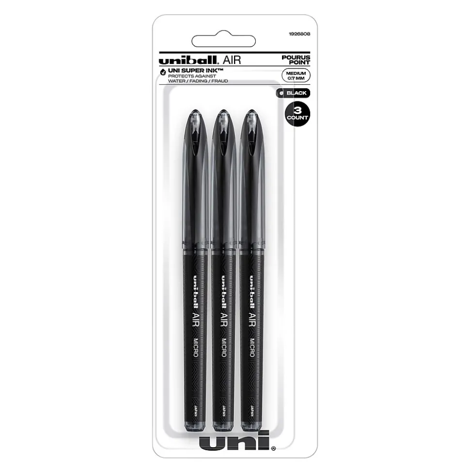 Enjoy a smooth writing experience with AIR Porous Point Rollerball Pens from uniball featuring a 0.7mm medium point. These pens have an innovative sleek tip that writes at any angle while producing crisp, skip-free lines. The porous point rollerball pens adapt to your personal writing grip style, adjusting line widths depending on the pressure of your hand as you write. Combining the fluid ink of a marker with the durability of a rollerball, these pens deliver a smooth writing experience while ensuring your documents are easy to read. Suitable for a variety of writing tasks including journaling, scrapbooking or sketching, these pens are available in assorted colors that glide easily over paper, delivering vibrant marks and lines. uni Super Ink technology ensures the ink adheres strongly to the paper, offering protection from fraud, fading and water. A glass-like plastic clip gives these fine marking pens a stylish look while adding a touch of convenience. Experience effortless writing the moment the pen hits the paper with AIR’s versatile cushion tip technology and fluid, free flowing ink.