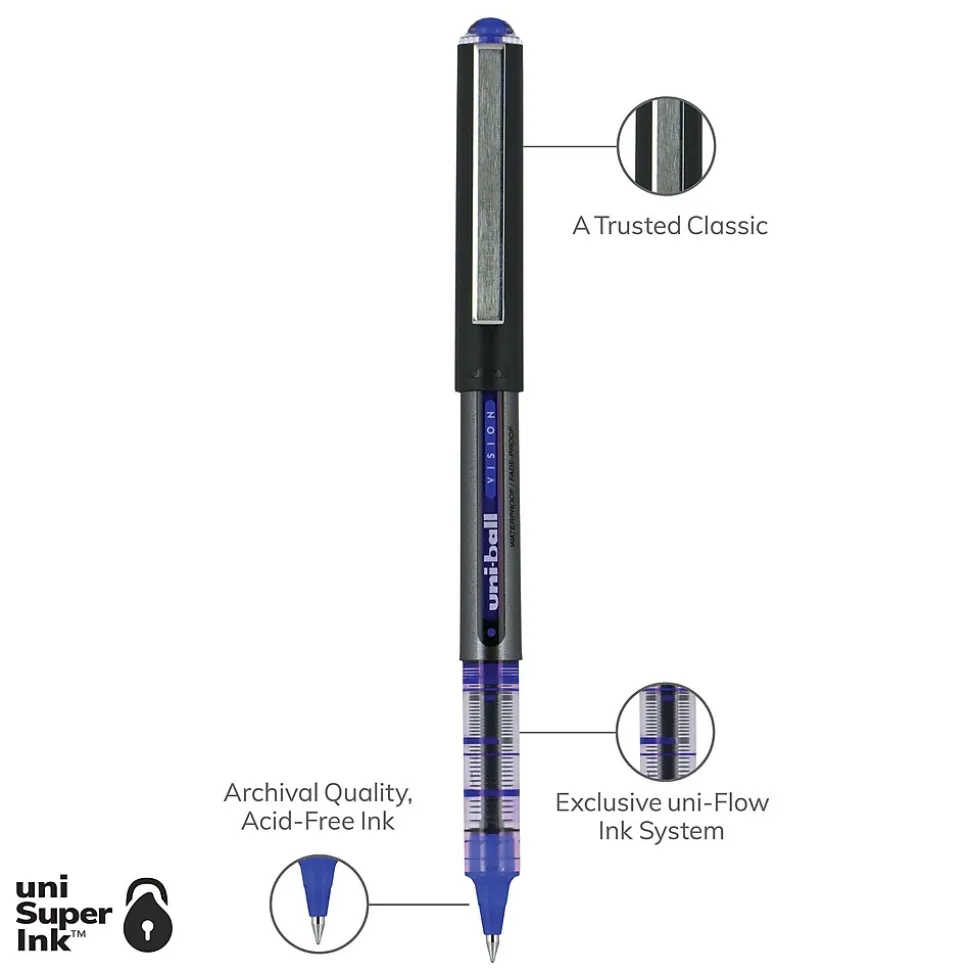 Make your everyday writing easy with the effortless and dependable performance of Vision Rollerball Pens from uniball available in multiple tip sizes. Capped roller pens deliver an even liquid ink lay-down for reliably smooth, vivid lines and a rich color for improved clarity and readability. Great for all writing tasks from taking notes to record keeping with archival quality, acid free roller ink. Innovative uni Super Ink technology forms an indestructible bond with the paper to minimize the risk of check washing or document fraud, while also protecting from water and fading. The exclusive Uni-Flow Ink System ensures a consistent, delightfully fluid writing experience, and a translucent window ensures that you don’t run out of ink unexpectedly. Enjoy beautiful clean lines and give all of your ideas a burst of brilliant color with this classic style rollerball pen.
