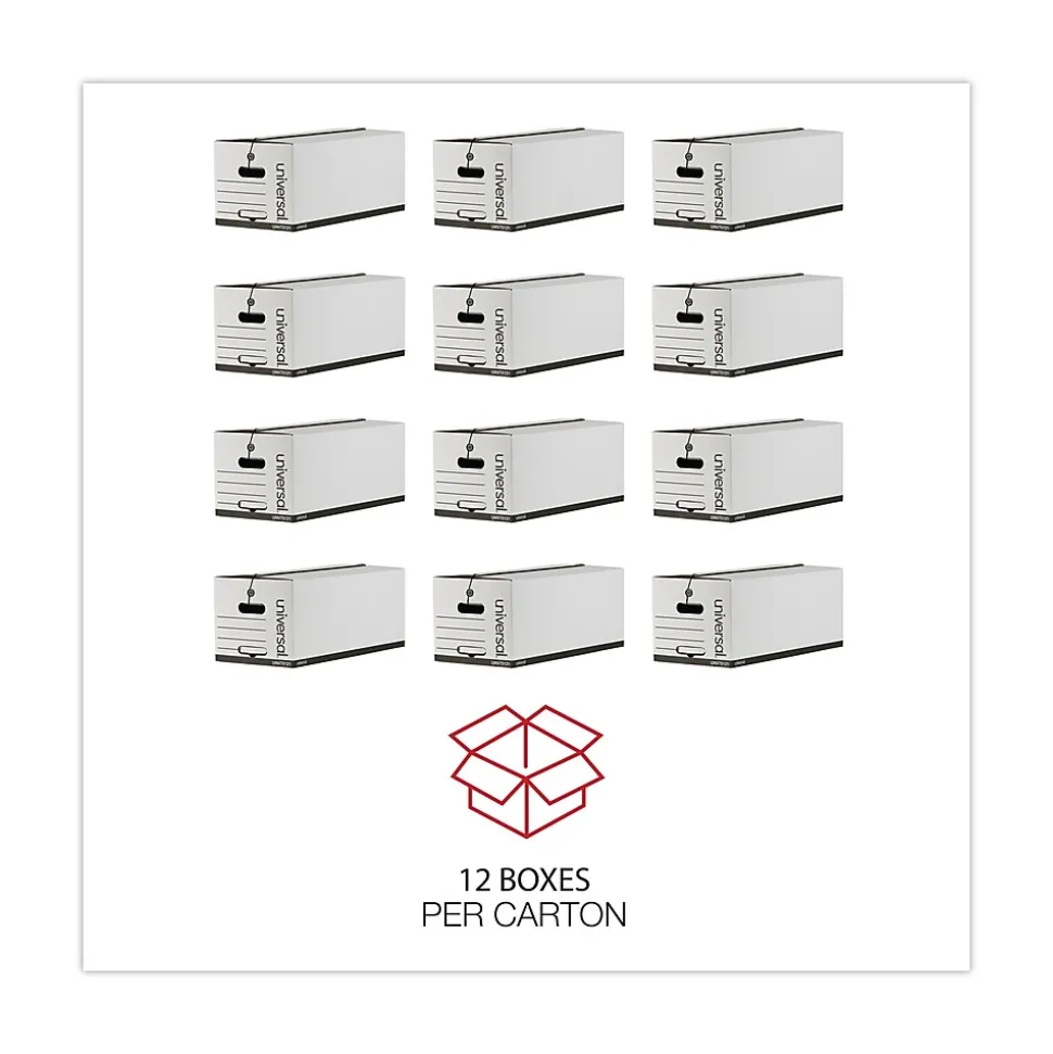 Keep the previous year’s marketing figures secure but within easy reach with this Universal string-and-button box. Fitting letter-size documents, this storage box can be resealed repeatedly, and because the surface is white, it’s easy to note the contents for quick retrieval. This Universal string-and-button box has built-in carry handles for transporting from office to storeroom and is constructed with sturdy corrugated fiberboard that contains 59 percent postconsumer recycled content.