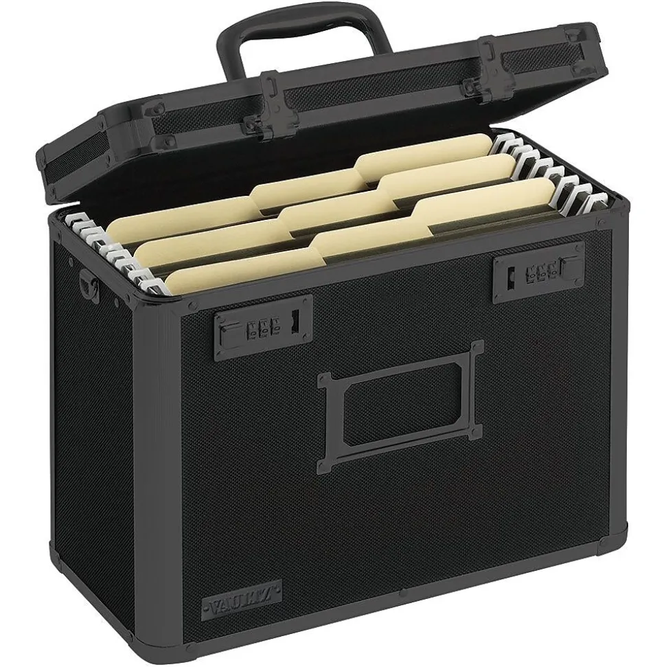 Slim letter-size file box secures your important files for transport. Internal rails are sized for letter-size hanging file folders. Double combination locks provide convenient security. 7 1/4″ depth and comfortable chrome handle make this item very portable. Chrome steel corners and aluminum rails offer strength. Chrome label holder on front perfect size for a business card. The Personal File Tote is also HIPAA compliant.