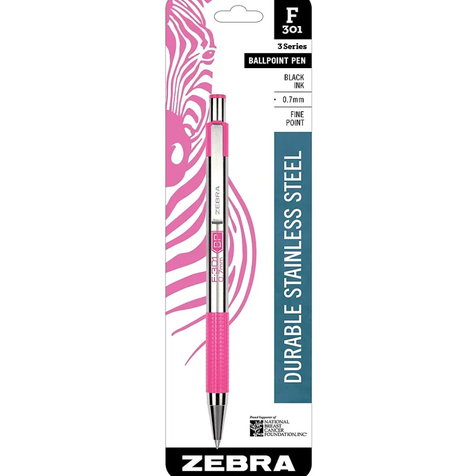 A pink accented F-301 allows style and strength to show support in the pursuit to end breast cancer.Combining style, strength, and value this is America’s number one metal ballpoint pen for a reason. This capped pen is compact and fits well in shirt pockets and small spaces. Refillable.